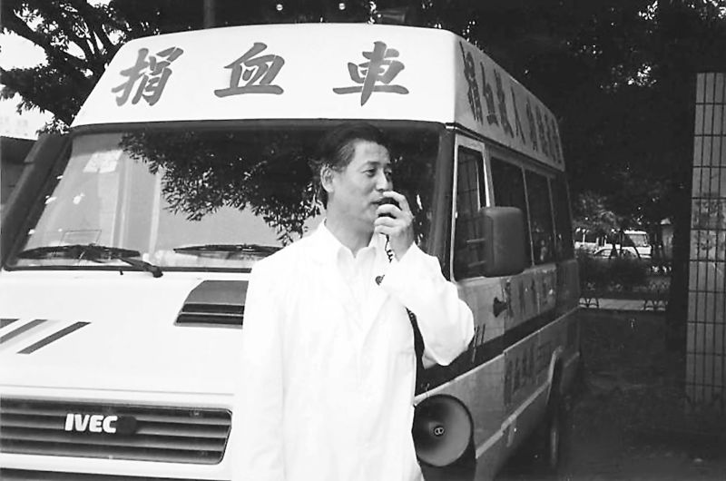 1995年5月7日,捐血車第一天開上街頭,血站老站長楊春森拿著擴(kuò)音器大嗽叭向市民宣傳。余海蓉攝