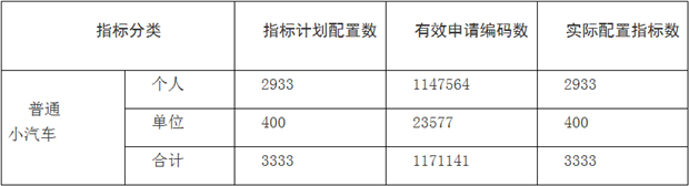 據(jù)悉,2018年第11期以搖號方式配置的普通小汽車增量指標(biāo)共3333個,其中個人2933個、單位400個。參加搖號的有效編碼數(shù)共1171141個,其中個人普通小汽車有效編碼1147564個,單位普通小汽車有效編碼23577個。