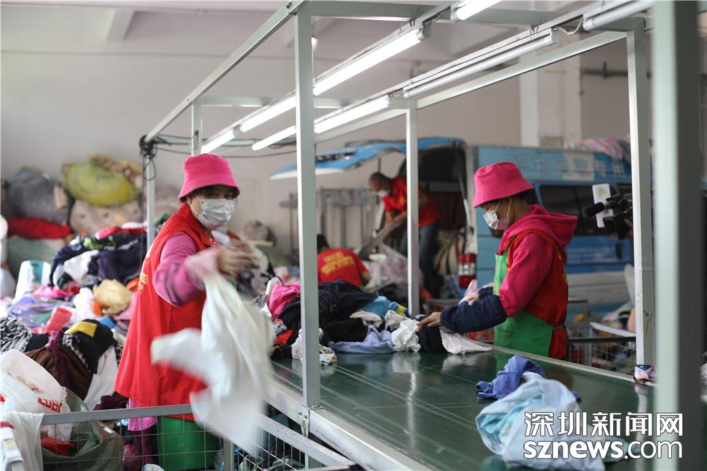在分揀庫(kù)內(nèi),有兩個(gè)傳送帶,工作人員將分揀出來(lái)的衣服放置在分揀帶上,兩名工作人員在分揀帶中間,背后放有多個(gè)分揀筐,通過(guò)傳送帶前端傳遞過(guò)來(lái)的衣物,工作人員快速的將衣服分為校服、外套、短袖等類別進(jìn)行分揀工作,并放置在相應(yīng)的分揀筐中。