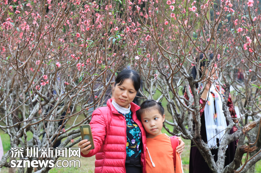 市民在桃花林與桃花合影留念