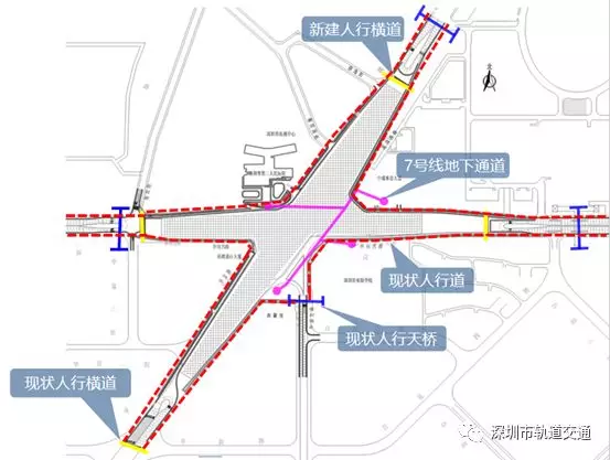 行人可利用平交路口、既有人行天橋、地下通道、7號(hào)線4個(gè)出入口過街。
