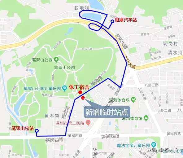 (1)新增筆架山總站-銀湖汽車總站聯(lián)系線路,線路雙向途經(jīng)筍崗路、梅崗路、泥崗西路、北環(huán)大道。停靠銀湖汽車站(銀湖地鐵站)、體工宿舍、市二醫(yī)院①(黃木崗地鐵站)、筆架山總站。(詳見圖5)