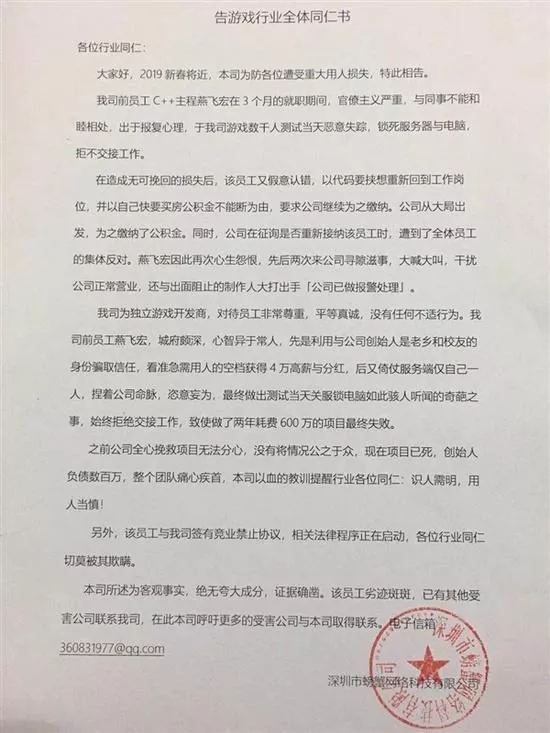從微博大V“首席內(nèi)幕官”曬出的信息顯示,涉事程序員名叫“燕飛宏”,依仗服務(wù)端僅自己一人,捏著公司命脈,恣意妄為,在游戲測試當(dāng)天關(guān)服鎖電腦,拒絕交接工作,致使做了2年耗費(fèi)600萬元的項(xiàng)目最終失敗。