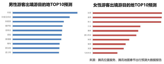 根據(jù)性別劃分,女性游客最感興趣的目的地是法國(guó)、泰國(guó)、瑞士、日本、韓國(guó)等國(guó)家,要么是浪漫之都,要么是購(gòu)物天堂;而男性游客的興趣則更為廣泛,占比最多的目的地包括印度、印度尼西亞、阿聯(lián)酋、俄羅斯、菲律賓等。