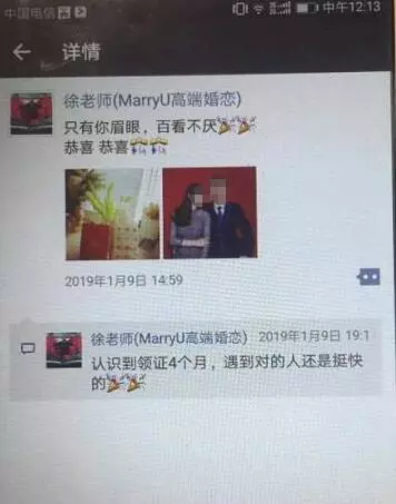 沒想到半個月之后,陳先生的朋友發(fā)現(xiàn),他的結(jié)婚照出現(xiàn)在了一個婚戀公司員工的朋友圈里。陳先生告訴記者,這個員工轉(zhuǎn)發(fā)他的照片同時(shí)還在上面評論寫上“認(rèn)識到領(lǐng)證四個月,遇到對的人還是挺快的”。