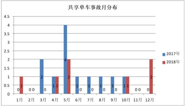 從事故多發(fā)月份來(lái)看,5月份是共享單車(chē)事故的高發(fā)月份,在2017年和2018年兩年中,五月份均是死亡人數(shù)最多的月份。兩年中,發(fā)生在5月份的事故死亡人數(shù)共6人,占總死亡人數(shù)的31.58%。