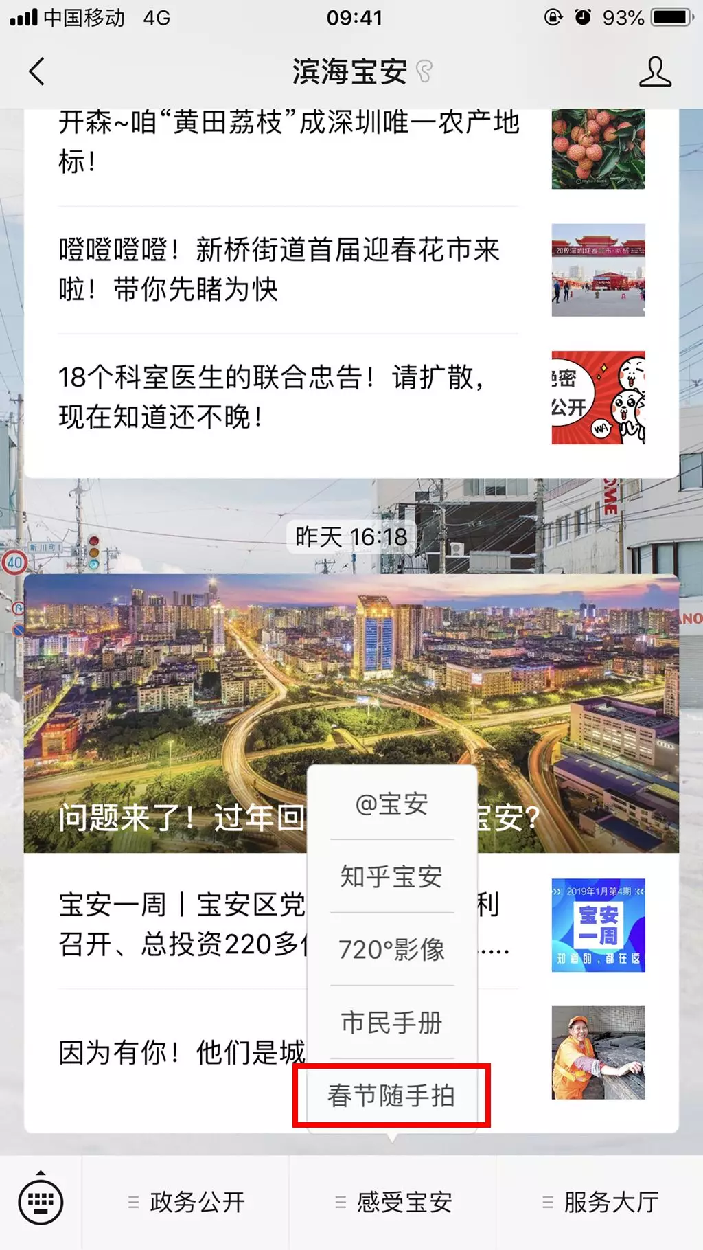 1、掃碼關(guān)注“濱海寶安”微信公眾號,在下方菜單欄中點(diǎn)擊“春節(jié)隨手拍”參與活動。
