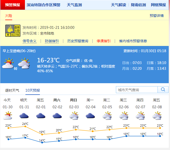 深圳新聞網(wǎng)2019年1月30日訊 深圳今日天氣多云,氣溫16-23℃,東風(fēng)2-3級(jí),相對(duì)濕度40%-80% ;31日多云轉(zhuǎn)陰天,偶有零星小雨;2月1日受冷空氣影響,有分散小雨,沿海和高地最大陣風(fēng)7級(jí),氣溫下降,天氣轉(zhuǎn)涼;2-3日多云,早晚有輕霧,氣溫上升;4-5日陰天間多云,有輕霧和短時(shí)小雨。