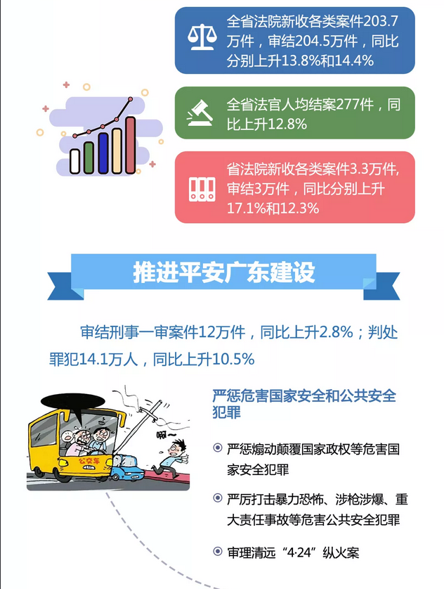 深圳新聞網(wǎng)2019年1月30日訊(記者 張玲 牛耘 發(fā)自廣州)1月30日上午,廣東省十三屆人大二次會(huì)議舉行第二次全體會(huì)議,人大、兩院報(bào)告內(nèi)容齊亮相。2018年,廣東法院做了哪些工作,交出了一份怎樣的成績(jī)單?廣東省高級(jí)人民法院院長(zhǎng)龔稼立在廣東省高級(jí)人民法院工作報(bào)告中公布了一組數(shù)據(jù):2018年,全省法院新收各類(lèi)案件203.7萬(wàn)件,審結(jié)204.5萬(wàn)件,同比分別上升13.8%和14.4%;法官人均結(jié)案277件,同比上升12.8%;案件再審糾錯(cuò)率1.2‰,案訪(fǎng)比連續(xù)下降。其中,省法院新收各類(lèi)案件3.3萬(wàn)件,審結(jié)3萬(wàn)件,同比分別上升17.1%和12.3%。
