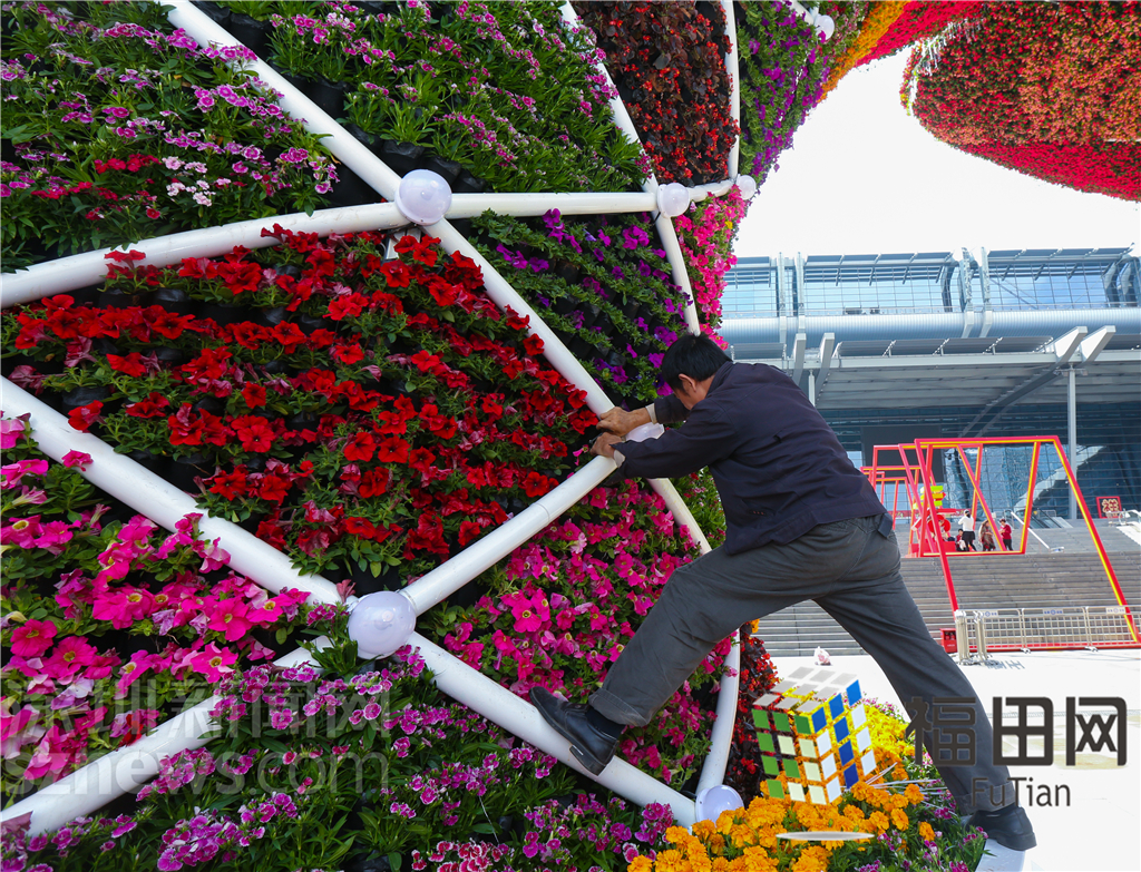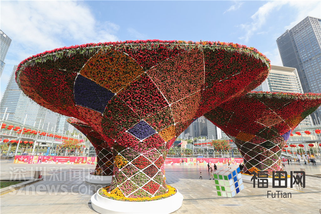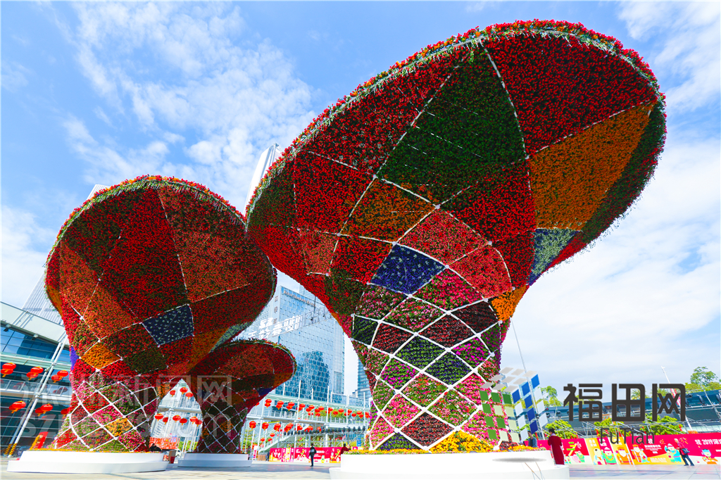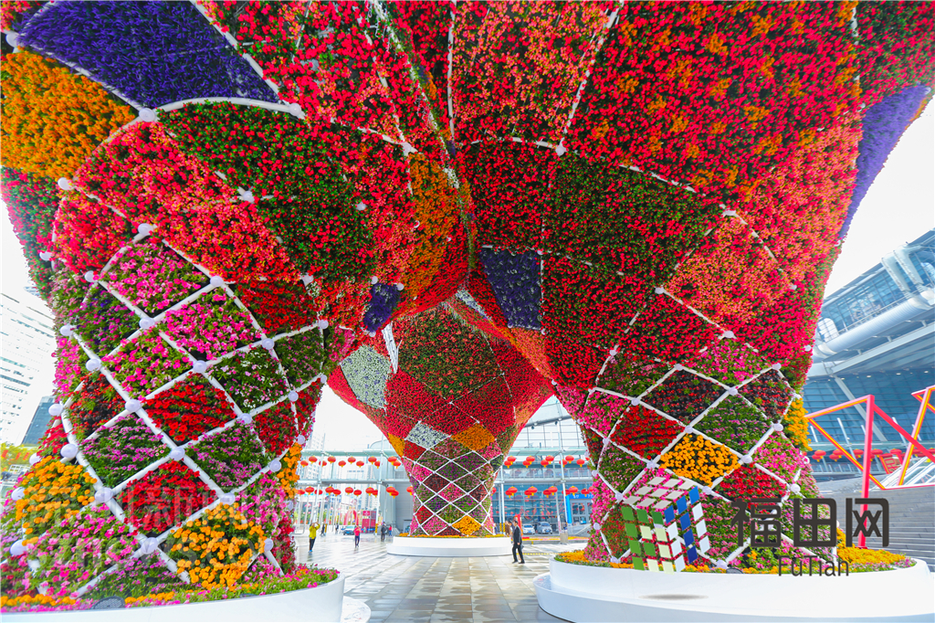 在會展中心門口,首先映入眼簾的便是一座高15米,寬40米的迎春花市門樓。記者了解到,該門樓本身就是一件花卉藝術(shù)作品,主題為——花開鵬城。以盛開抽象的花形為設(shè)計元素,采用流暢的交織曲線并結(jié)合七彩花卉,打造一種花開鵬城的韻味,突出迎春花市的氣息。