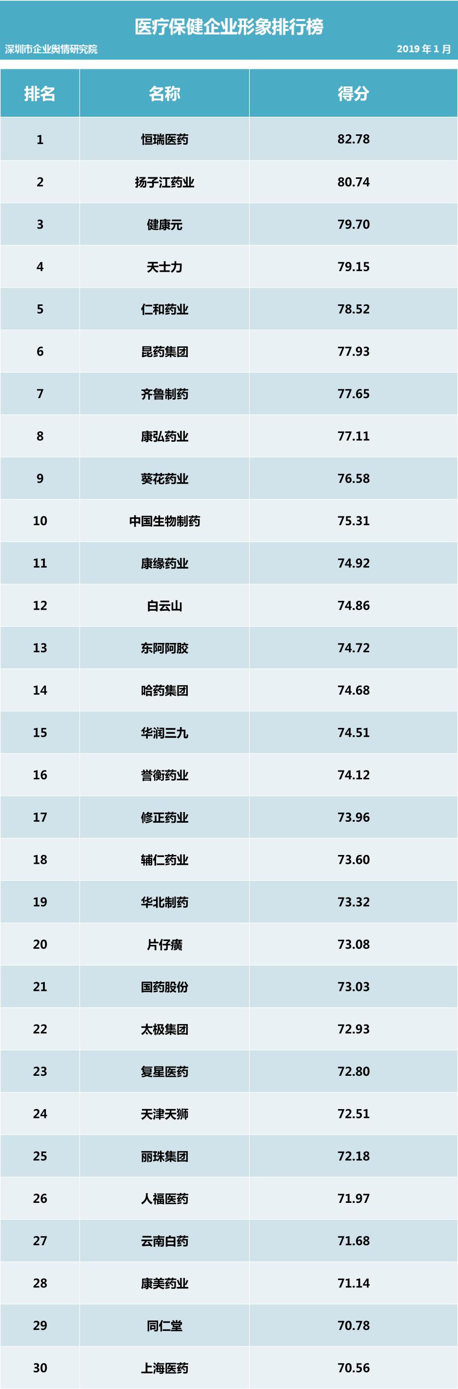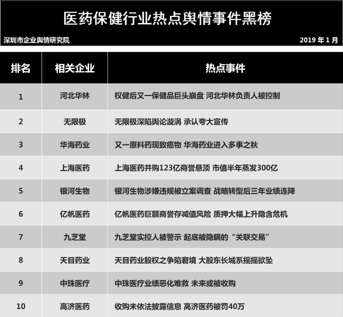 深圳新聞網(wǎng)2019年1月31日訊 (記者田志強(qiáng) 通訊員陳文光)1月31日,深圳企業(yè)輿情研究院發(fā)布第十二批企業(yè)輿情榜單。本次榜單重點(diǎn)聚焦房地產(chǎn)及醫(yī)藥保健兩個(gè)行業(yè)。醫(yī)藥保健行業(yè)輿情榜單由醫(yī)療保健行業(yè)熱點(diǎn)輿情事件排行榜(紅、黑榜)及醫(yī)藥保健行業(yè)企業(yè)公眾形象排行榜組成。