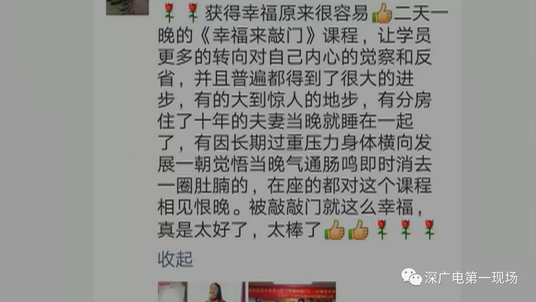 李先生說,價格雖然有點兒高,但如果能夠讓妻子變好,那也無話可說,然而妻子參加完后面課程回來以后,像是被洗腦了一樣。他偷偷看妻子的微信群,都在談?wù)撜n程有神奇的效果,有人在朋友圈推銷說:聽了課程之后,分房住了十年的夫妻當晚就睡在一起。