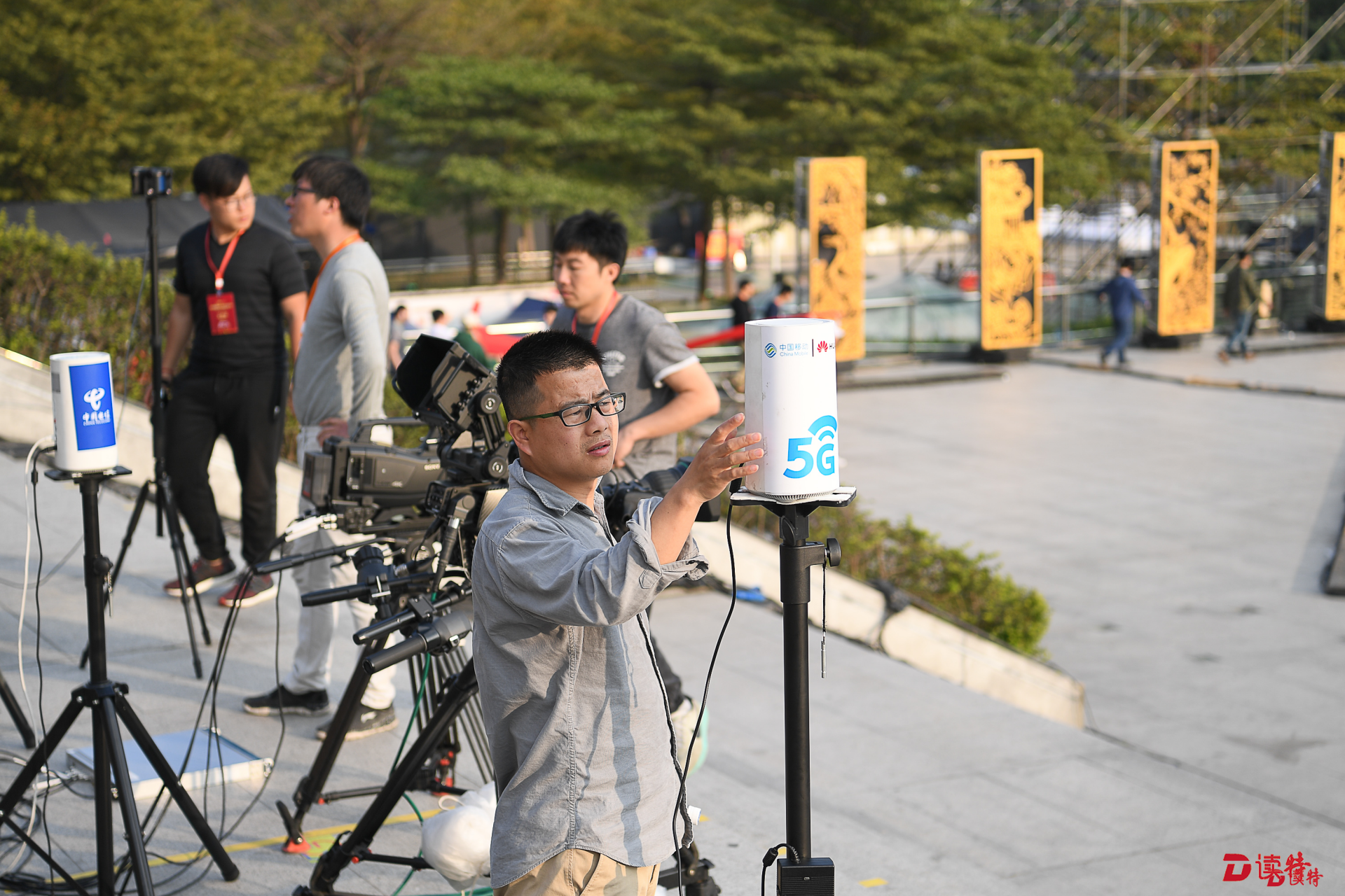 在市民中心廣場(chǎng),央視的5G網(wǎng)絡(luò)VR實(shí)時(shí)制作團(tuán)隊(duì)連日來(lái)已經(jīng)在反復(fù)調(diào)試設(shè)備。記者看到,他們的設(shè)備相當(dāng)簡(jiǎn)單便捷,包括有6個(gè)鏡頭的全景攝像頭和5G網(wǎng)絡(luò)接入終端,工作人員手持兩臺(tái)筆記本電腦用于現(xiàn)場(chǎng)VR視頻的縫合,從而實(shí)現(xiàn)VR超高清視頻通過(guò)5G網(wǎng)絡(luò)的制作和回傳。