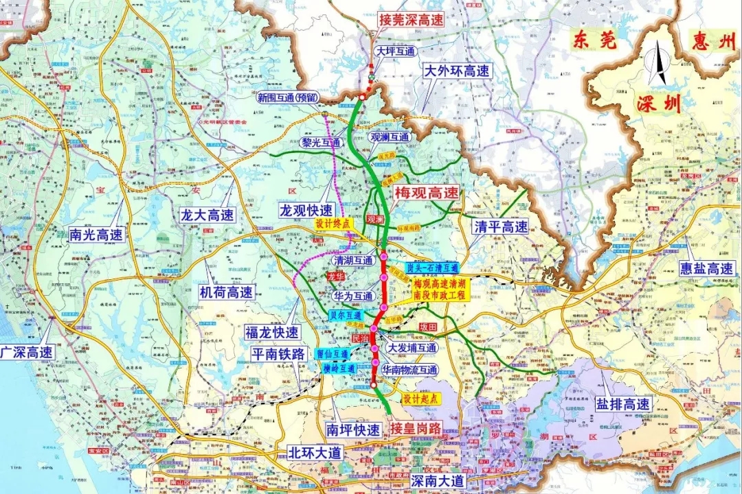 南起原梅林主線收費(fèi)站南端,北至石清大道與清湖立交之間,與原北線擴(kuò)建工程起點(diǎn)對(duì)接,道路全長(zhǎng)約7.975公里。