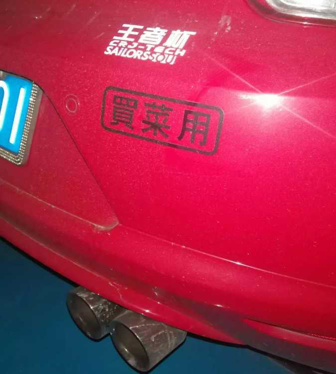 從圖中可以看出,上午還好好的一輛車,到了下午,車身下就多了幾個“本不該出現(xiàn)”的東西。再仔細一看,車身上還貼著“買菜用”字樣。