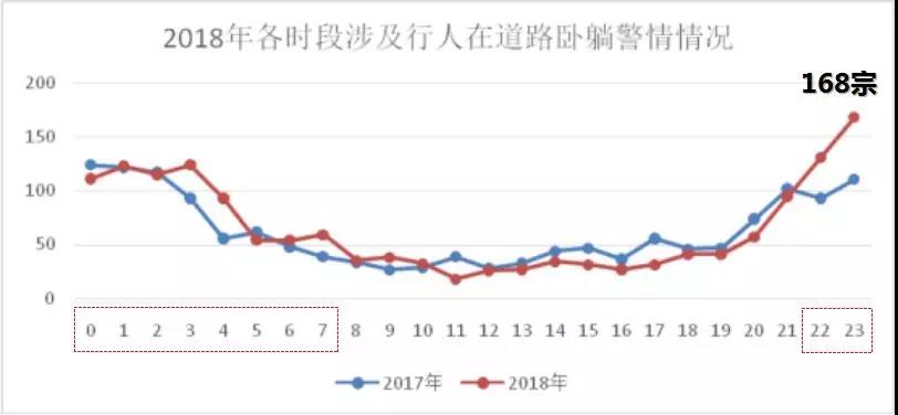 2018年接報(bào)涉及行人臥躺在道路警情中,最高峰值在夜間23時(shí),共接報(bào)警情168宗,高發(fā)時(shí)段在22時(shí)至次日7時(shí),共接報(bào)警情1032宗。