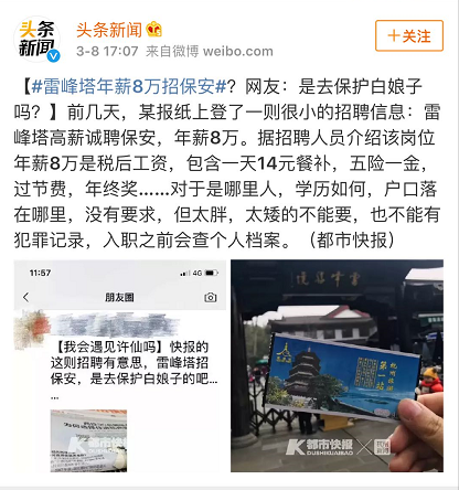 親,找工作嗎?聽說雷峰塔年薪8萬招保安