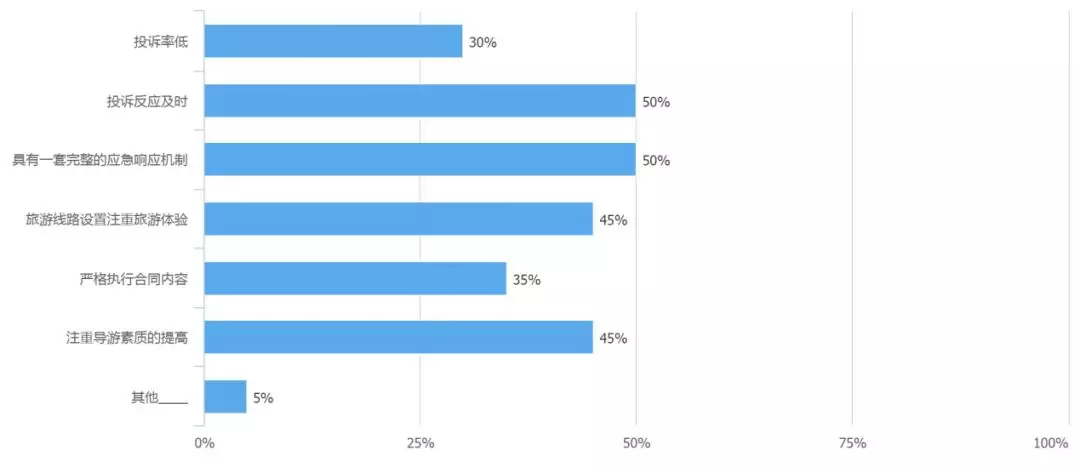 在眾多的旅游體驗(yàn)當(dāng)中,消費(fèi)者遇到的最主要的問題是強(qiáng)制購物、遭遇虛假宣傳、臨時更改旅游線路等問題,同時消費(fèi)者在選擇旅游線路時,“野馬旅行社”、導(dǎo)游的服務(wù)態(tài)度、安全等問題也在重點(diǎn)考慮范圍內(nèi)。在改進(jìn)旅行社服務(wù)質(zhì)量方面,80%的消費(fèi)者認(rèn)為現(xiàn)狀需要政府和網(wǎng)絡(luò)共同關(guān)注,才能營造良好的旅游環(huán)境。旅行社對于投訴案例的反應(yīng)機(jī)制和反應(yīng)速度,之后也將成為消費(fèi)者在選擇旅行線路時的重要考量標(biāo)準(zhǔn)之一。