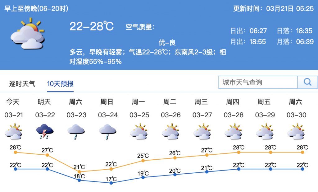 距離深圳平均入夏時間4月21日還有一個月,市民們也許已經有了初夏般的感受。預計21日多云間陰天,早晚有輕霧,氣溫23~28 ℃。