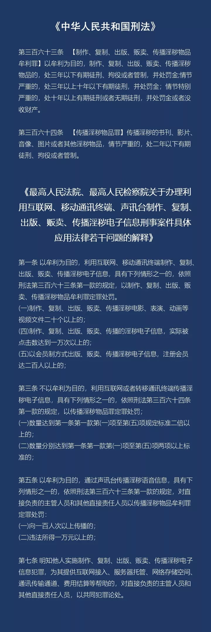 我國(guó)《刑法》規(guī)定了對(duì)傳播淫穢物品牟利罪、傳播淫穢物品罪的處罰,而最高法、最高檢2004年9月出臺(tái)的《關(guān)于辦理利用互聯(lián)網(wǎng)、移動(dòng)通信終端、聲訊臺(tái)制作、復(fù)制、出版、販賣、傳播淫穢電子信息的刑事案件具體應(yīng)用法律若干問題的解釋》,又對(duì)此類犯罪認(rèn)定做了詳細(xì)的解釋。