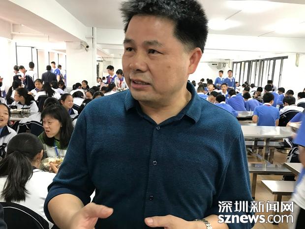 4月1日中午,深圳市福田區(qū)外國(guó)語(yǔ)學(xué)校校長(zhǎng)丁長(zhǎng)義跟學(xué)生一起在食堂就餐