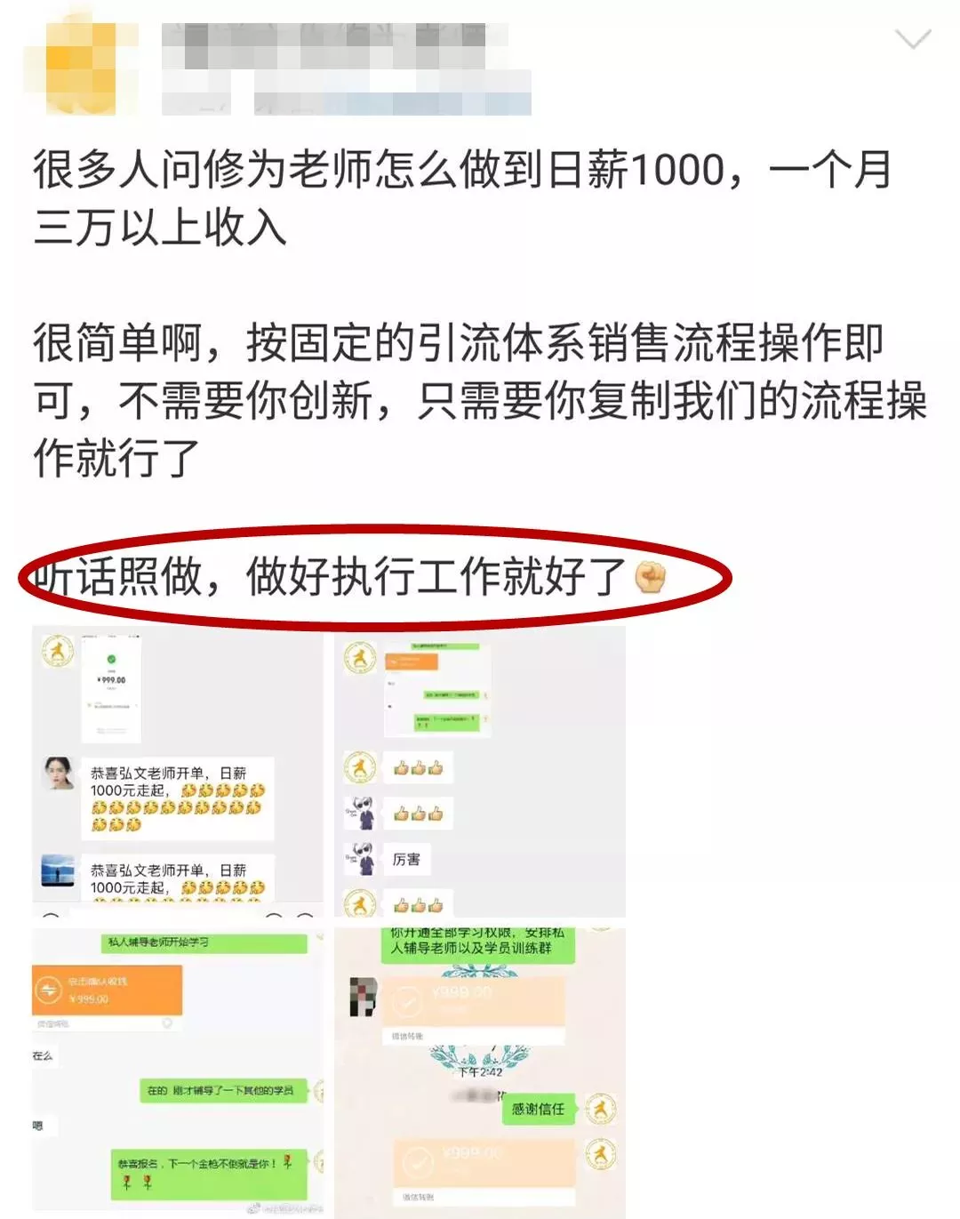 福道文化傳播有限公司從“服務(wù)老師”到“學(xué)員”,大多都是初中以下文化水平。一旦有新人繳納會費,該團伙成員立刻將受害人拉入“會員群”。在各“會員群”內(nèi),群內(nèi)其他人努力活躍氣氛,分享連某整理的“生財之道”,只為讓新人再繳納5000至10萬元不等的費用。