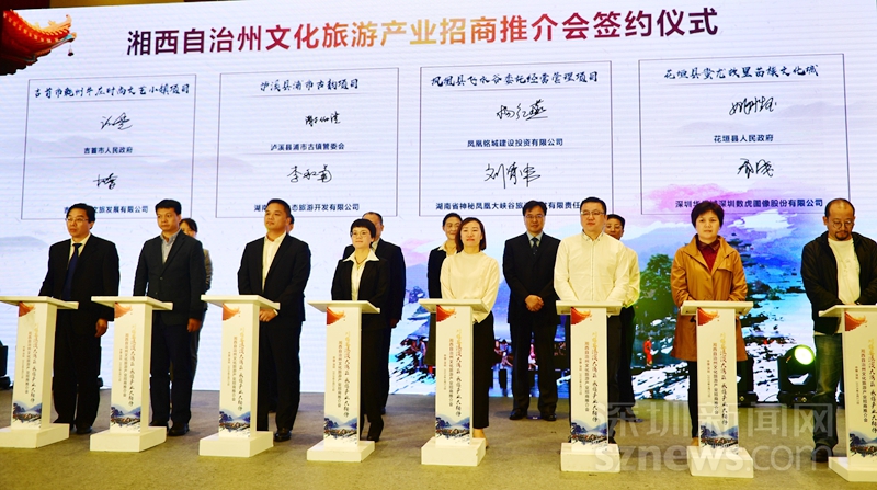 湘西州文化旅游產(chǎn)業(yè)推介會(huì)是“湘西自治州2019年湖南-粵港澳大灣區(qū)投資貿(mào)易洽談周”的重頭戲之一,由湘西自治州人民政府主辦,湘西州文化旅游廣電局承辦。會(huì)上簽約的8個(gè)旅游項(xiàng)目分別是:吉首市乾州牛莊時(shí)尚文藝小鎮(zhèn)項(xiàng)目、瀘溪縣浦市古韻項(xiàng)目、鳳凰縣飛水谷委托經(jīng)營管理項(xiàng)目、花垣縣蚩尤故里苗族文化城項(xiàng)目、保靖縣府庫紅石海景區(qū)項(xiàng)目、永順縣青坪鎮(zhèn)太平村“生態(tài)旅游康養(yǎng)度假區(qū)”項(xiàng)目、龍山縣太平山景區(qū)旅游項(xiàng)目、湘西吉鳳山生龍歡樂世界項(xiàng)目。國內(nèi)外眾多知名文化旅游投資商落戶湘西,標(biāo)志著湘西正成為一方潛力無限的文化旅游投資熱土和產(chǎn)業(yè)高地。