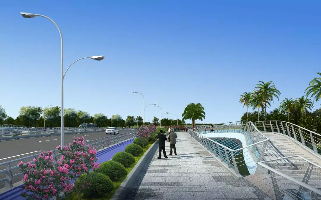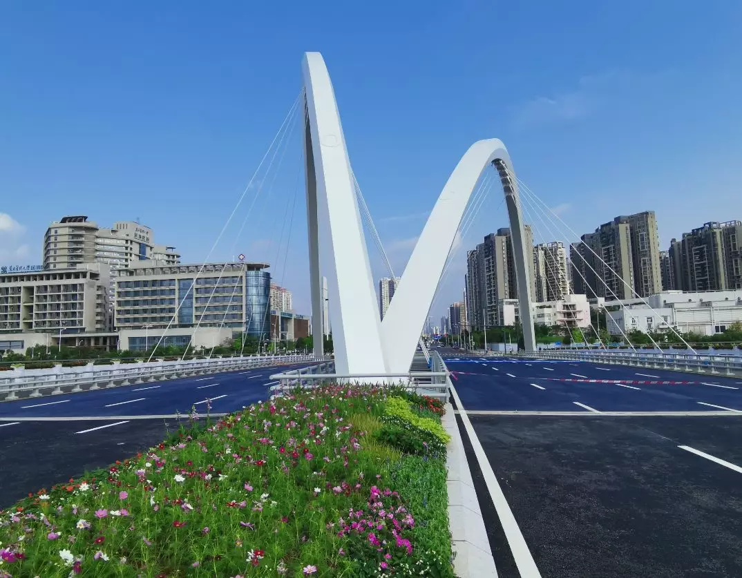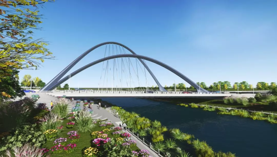 11號(hào)景觀橋以“融合”為主題,將流暢的線條融入景觀橋梁中,兩幅高低拱的線條無(wú)限延伸,猶如行云流水般瀟灑寫(xiě)意,一氣呵成;同時(shí),匯聚為一體的主拱又形成了“門(mén)”的形象符號(hào),迎接著八方來(lái)客。
