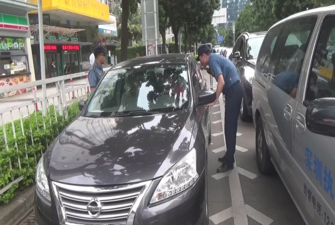 執(zhí)法人員例行對車牌號為粵BT***的小轎車進行檢查,司機將車窗降下,緩緩駛?cè)氪龣z區(qū)域。