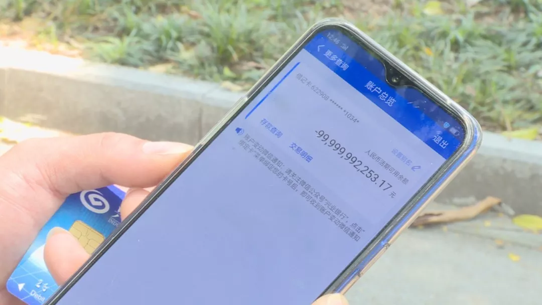 楊先生在今年2月中旬,經(jīng)朋友介紹來到深圳坪山工作,公司統(tǒng)一辦理了興業(yè)銀行的工資卡。楊先生說,第一個(gè)月發(fā)工資時(shí),他就發(fā)現(xiàn)工資取不出來,就以為是銀行卡沒激活,沒在意??墒钱?dāng)?shù)?月份的工資也用不了時(shí),楊先生趕緊下載了手機(jī)銀行,這一查,嚇了一跳!賬戶余額顯示:-99,999,992,253.17 (負(fù)999億余元)。