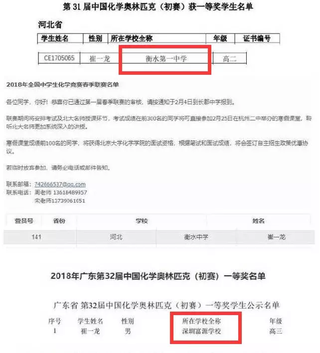 ↑ 家長提供資料顯示,圖中這位叫崔一龍的學(xué)生,于2018年代表衡水一中參加31屆奧林匹克化學(xué)獎,而再其高三的時候又代表富源中學(xué)拿了一等獎。