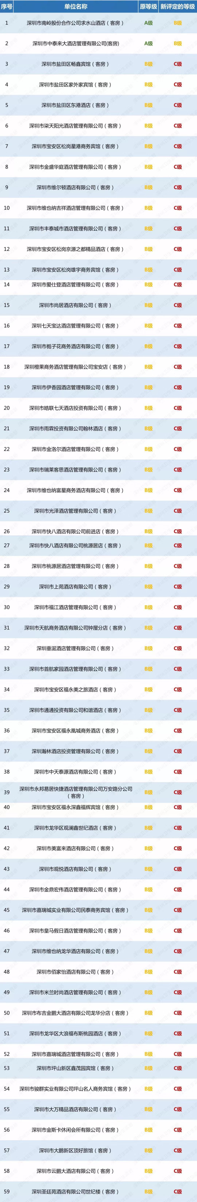 深圳新聞網(wǎng)2019年5月6日訊(記者 劉夢(mèng)婷)日前,記者從深圳的衛(wèi)監(jiān)局獲悉,為保障市民和來(lái)深旅客的健康權(quán)益,自2018年12月下旬開始,深圳市衛(wèi)生監(jiān)督部門集中開展專項(xiàng)整治行動(dòng),行動(dòng)中共檢查1660家酒店業(yè)單位,責(zé)令限期整改224家,立案95宗,共有59家單位在衛(wèi)生信譽(yù)等級(jí)評(píng)定復(fù)審工作中,被予以“降級(jí)”。據(jù)了解,2家原衛(wèi)生量化A級(jí)單位被降為B級(jí),57家原衛(wèi)生量化B級(jí)單位被降為C級(jí),其中不乏部分知名連鎖酒店業(yè)單位,如七天、維也納等品牌。