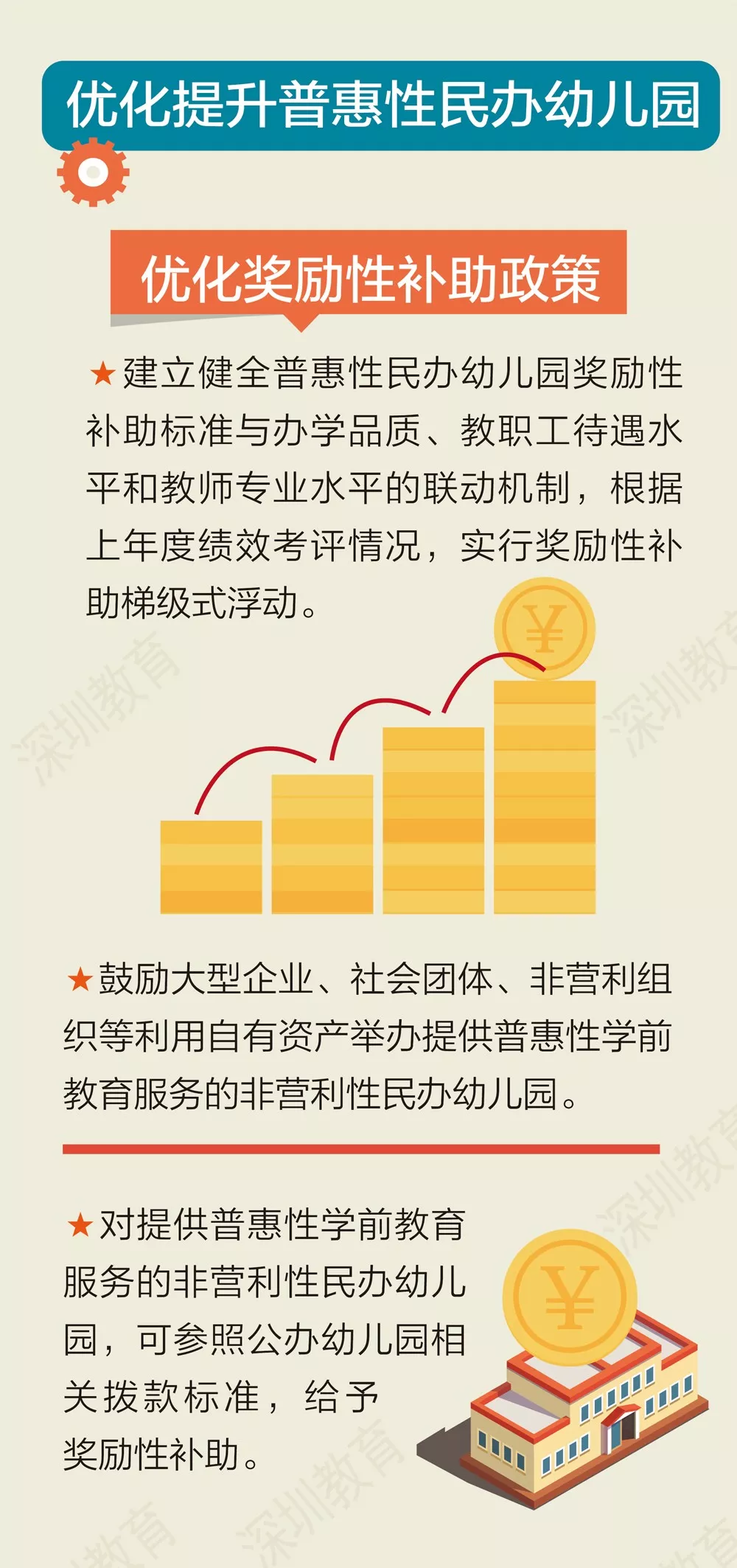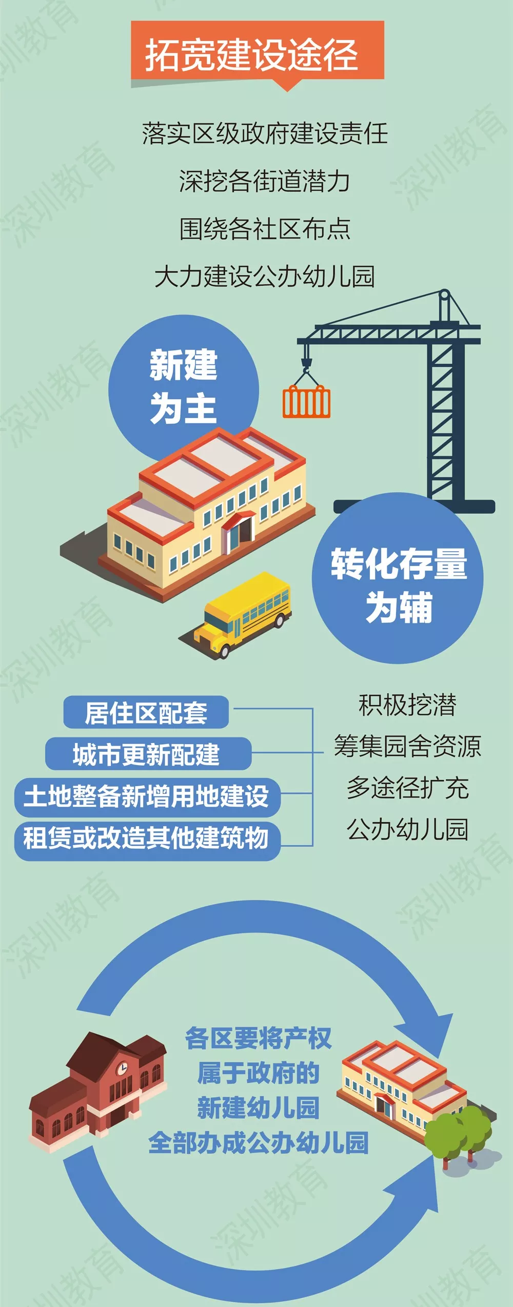 深圳公辦園建設(shè)策略將以市政府主導(dǎo)統(tǒng)籌推進(jìn)動(dòng),各區(qū)政府履行主體責(zé)任,挖掘各街道潛力,圍繞各社區(qū)布點(diǎn),力爭(zhēng)每個(gè)社區(qū)有1-2所公辦園,每年新建2萬(wàn)個(gè)以上學(xué)前教育學(xué)位。加大幼兒園規(guī)劃與建設(shè)力度,鼓勵(lì)社會(huì)力量興辦幼兒園和其他類型學(xué)前教育機(jī)構(gòu)。