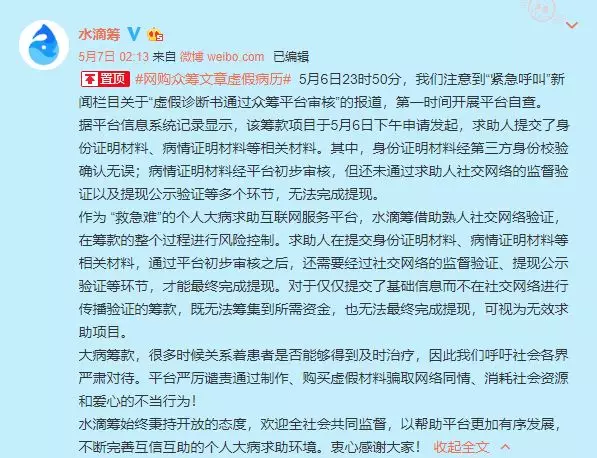 水滴籌官方微博稱(chēng),據(jù)平臺(tái)信息系統(tǒng)記錄顯示,記者提交的虛假眾籌款項(xiàng)目于5月6日下午申請(qǐng)發(fā)起,求助人提交了身份證明材料、病情證明等相關(guān)材料。
