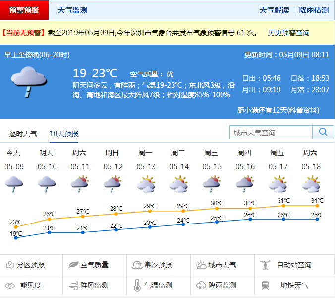 市氣象局預計,9日深圳以陰天天氣為主,有中到大雨,局部暴雨;氣溫在19-23℃;沿海、高地和海區(qū)最大陣風6-7級。10-11日以多云天氣為主,有短時陣雨。12日起多云,氣溫明顯回升。