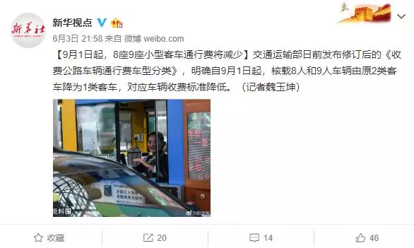 核載8人和9人車輛由原2類客車降為1類客車,降低了對應車輛的收費標準