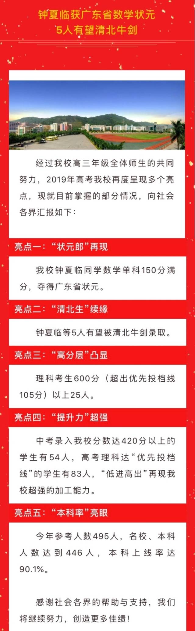 學校稱其2019年高校“高分層”凸顯,理科考生600分(超出優(yōu)先投檔線105分)以上25人;“本科率”亮眼,今年參考人數(shù)495人,名校、本科人數(shù)達到446人,本科上線率達90.1%;此外,還提到“提升力”,稱中考錄入該校分數(shù)達420分以上的學生有54人,高考理科達“優(yōu)先投檔線”的學生有83人,實現(xiàn)“低進高出”。