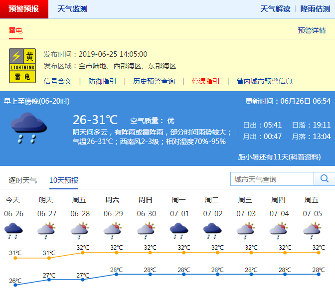 市氣象局預(yù)計(jì)深圳今日氣溫26-31℃;陰天間多云,有陣雨或雷陣雨,部分時(shí)間雨勢(shì)較大;西南風(fēng)2-3級(jí);相對(duì)濕度70%-95%。提醒市民未來(lái)幾天雷陣雨多發(fā),注意躲避雷暴和局地短時(shí)強(qiáng)降水。