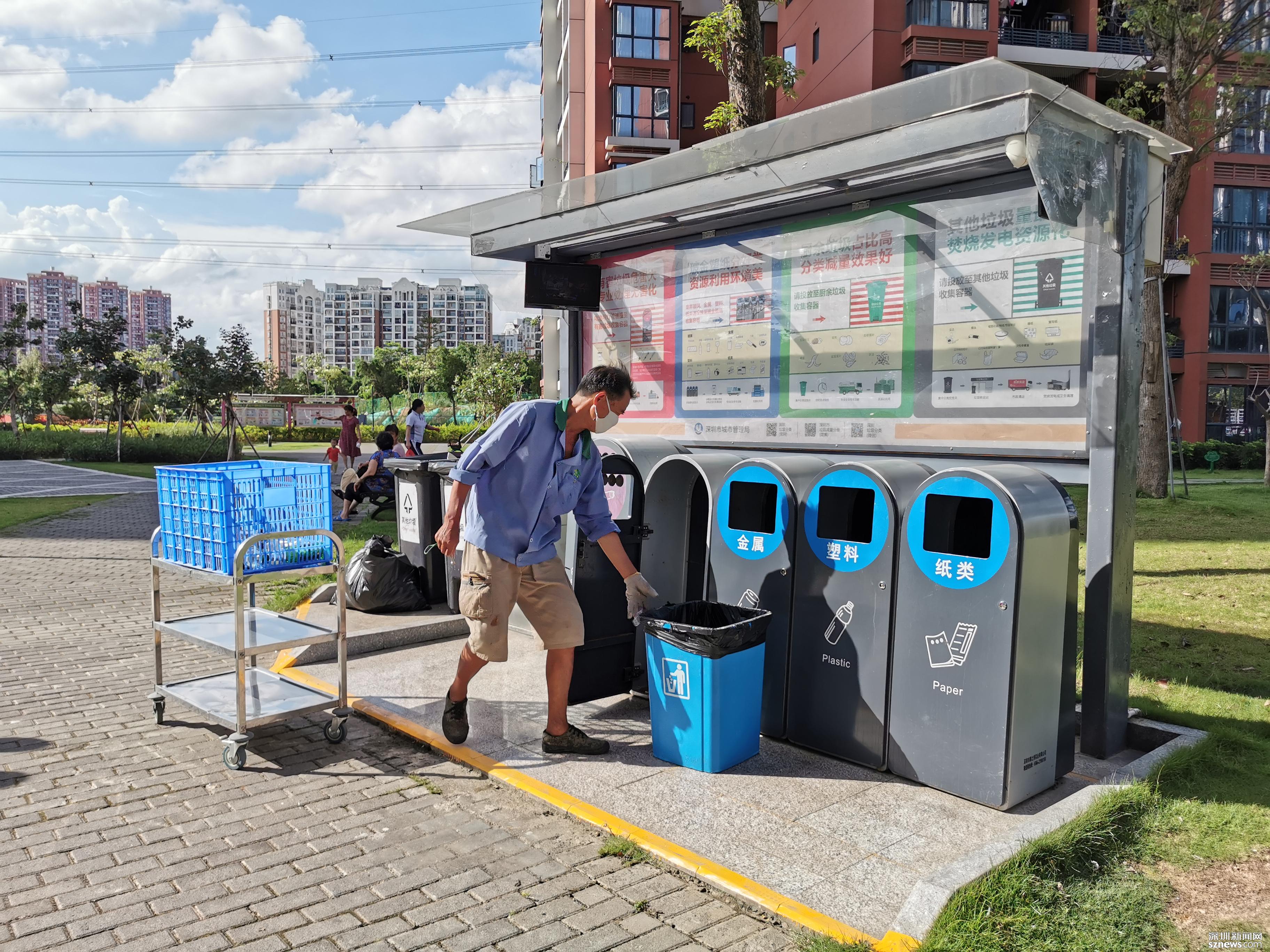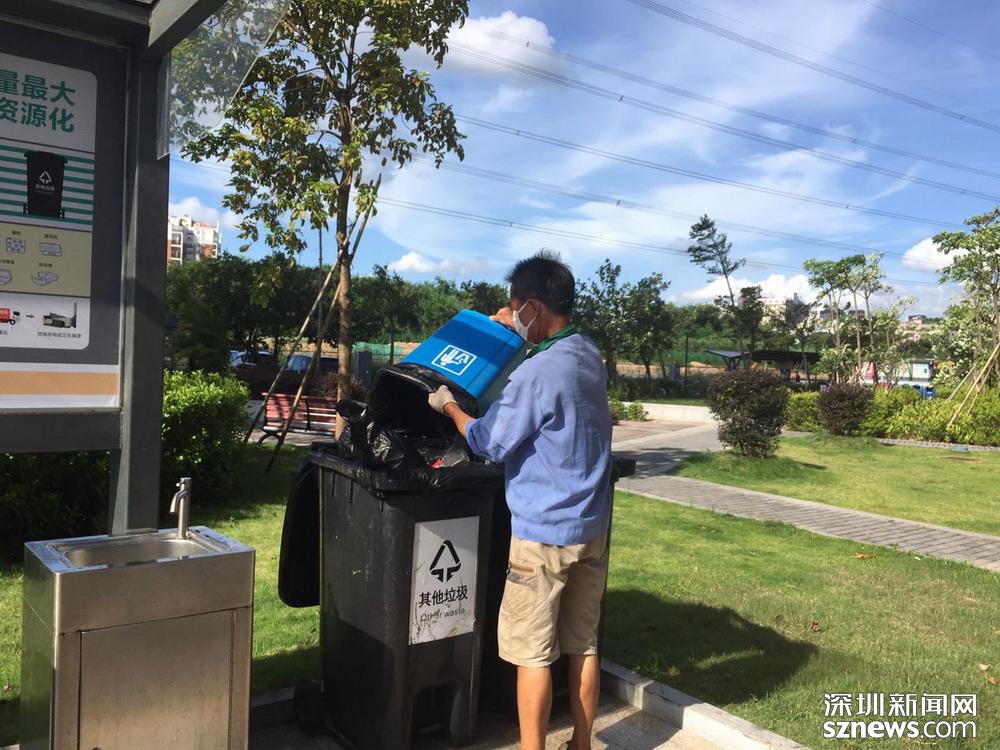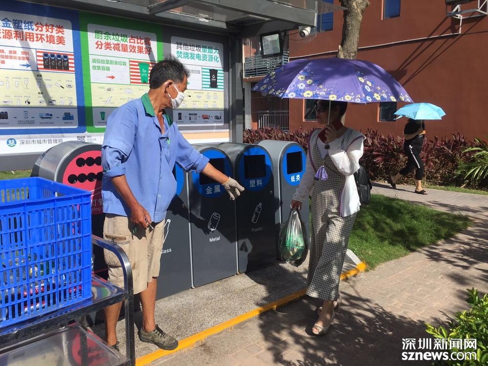 鄧伯今年60歲,是來深圳帶孫子的,因為老伴能幫忙,所以他應(yīng)聘成為了一名小區(qū)清潔員。小區(qū)實行垃圾分類一年多以來,鄧伯工作輕松了很多。每天他只需巡視幾遍垃圾桶,將滿了的垃圾裝在框里帶回暫存點,進行二次分揀和清洗后,再將垃圾桶歸放原處;等物業(yè)在微信平臺上聯(lián)系好運送車輛,協(xié)助運送人員運走垃圾就行。