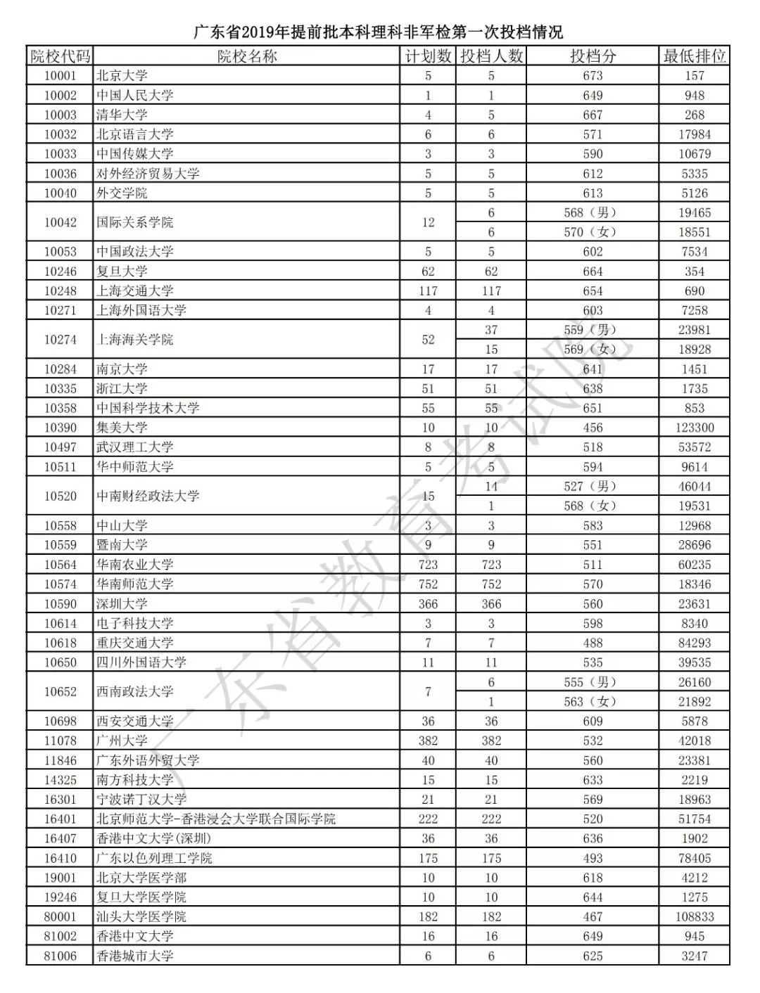 廣東省2019年提前批本科非軍檢第一次投檔情況公布