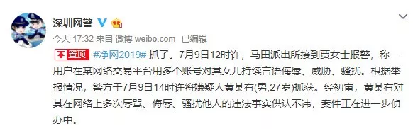 深圳公安發(fā)出警情通報,7月9日下午兩點左右,將犯罪嫌疑人黃某有抓獲。經(jīng)初審,黃某有對其在網(wǎng)絡(luò)上多次辱罵、侮辱、騷擾他人的違法事實供認(rèn)不諱。目前,案件正在進一步偵辦當(dāng)中。