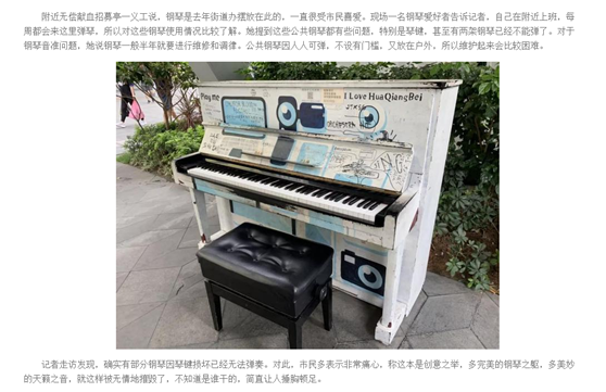 不過(guò),可正當(dāng)市民想上前去體驗(yàn)一把,發(fā)現(xiàn)鋼琴鍵盤蓋被亂涂亂畫,且部分琴鍵已經(jīng)損壞,這讓不少喜歡鋼琴的市民十分氣憤和痛心。