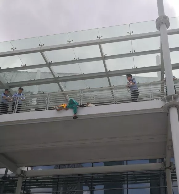 “阿伯,您先上來,別沖動(dòng)!我們是警察,遇到什么困難跟我們說,我們盡量幫您解決!”吳第警官和緩地對(duì)男子說。然而男子并不配合,甚至在外欄桿上躺下了。這個(gè)舉動(dòng)讓在場(chǎng)的所有人都倒吸了一口冷氣。