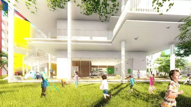項(xiàng)目打破傳統(tǒng)整齊排列的布局方式,打造出4個(gè)與邊界呼應(yīng)的靈活體塊,在保證幼兒園首層活動(dòng)空間完整最大化的同時(shí),將新舊校舍結(jié)合,打造一個(gè)聯(lián)通式共享庭院。新建校舍為每一個(gè)班級(jí)都提供了專屬的室內(nèi)外無(wú)邊界活動(dòng)空間。除首層班級(jí)與室外活動(dòng)空間直接連通以外,二、三層班級(jí)外設(shè)有錯(cuò)落的活動(dòng)露臺(tái)及挑檐,實(shí)現(xiàn)每層均可嬉戲、游樂(lè)、探索的布局。