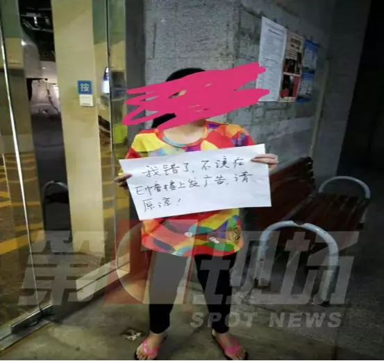 ▲女子手持道歉牌,上面寫(xiě)著:“我錯(cuò)了,不應(yīng)該在E棟樓上發(fā)廣告,請(qǐng)?jiān)彙?/p>