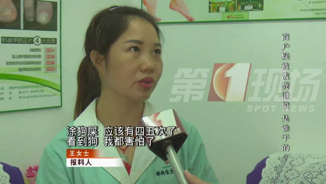 深廣電第一現(xiàn)場2019年7月26日訊 市民王女士在深圳黃貝嶺附近經(jīng)營著一家治療灰指甲的店,24日午夜時分,有一神秘人在她店門口潑了黃褐色的物體,讓王女士現(xiàn)在看到狗都怕,到底發(fā)生了什么?這跟狗又有啥關(guān)系?