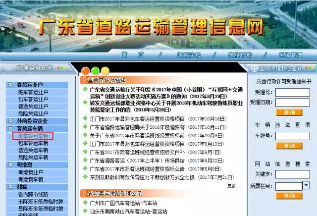 登錄廣東省道路運輸管理信息網(wǎng),點擊左側(cè)菜單欄中的「客貨運車輛」,再點擊「客班車客運車輛」,就能進(jìn)入到查詢頁面。