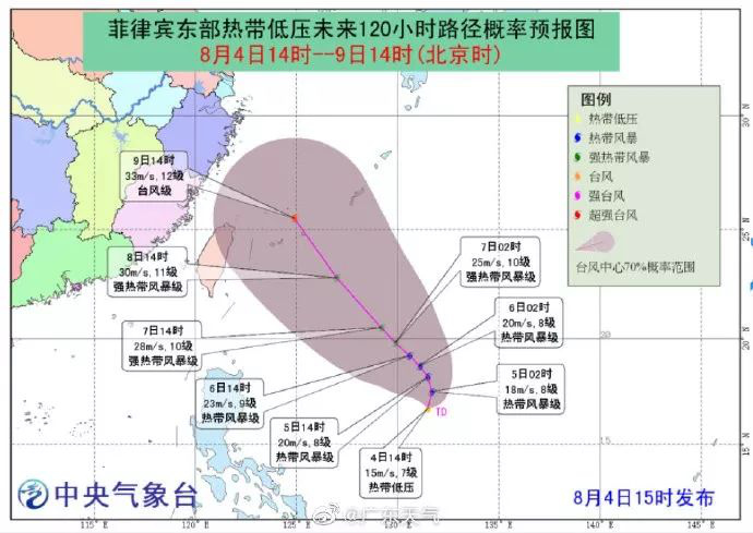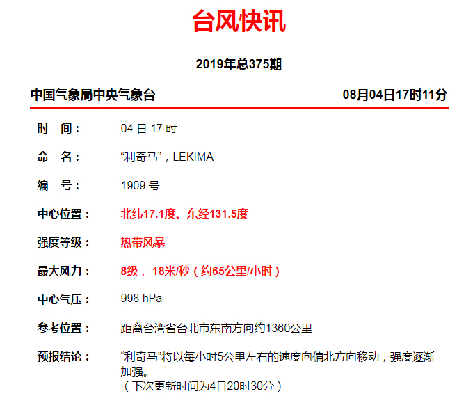 今年第9號(hào)臺(tái)風(fēng)"利奇馬"(熱帶風(fēng)暴級(jí))(英文名稱:LEKIMA;名字來源:越南;名字意義:一種水果)已于4日下午在西北太平洋洋面生成,17時(shí)其中心位于我國(guó)臺(tái)灣省臺(tái)北市東南方約1360公里的西北太平洋洋面上,中心附近最大風(fēng)力8級(jí)(18米 /秒),中心最低氣壓998百帕,七級(jí)風(fēng)圈半徑250-420公里。