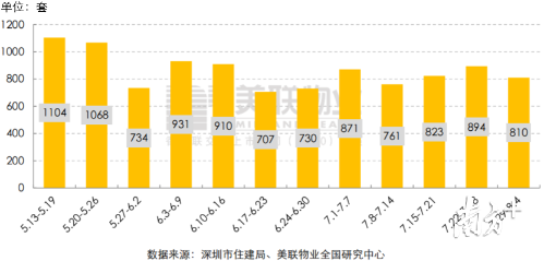 7月29日-8月4日一周內(nèi),全市共簽約成交一手住宅810套/7.7萬㎡,環(huán)比分別下降9.4%和10.2%。成交量連續(xù)兩周環(huán)比增長之后,出現(xiàn)了大約1成的下降。