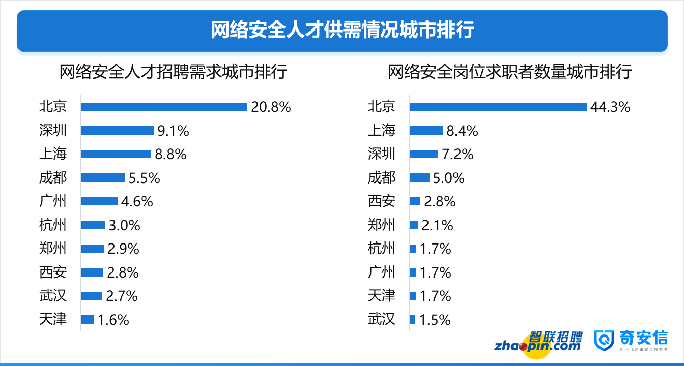 相比于2018年,在招聘需求排行榜上,排名前五的城市為:北京、深圳、上海、廣州、杭州。到2019年,成都網(wǎng)絡(luò)安全人才招聘需求回升至前五名,由2018年的2.5%(排名第七)增長(zhǎng)到2019年的5.5%(排名第四)需求量直線升高。